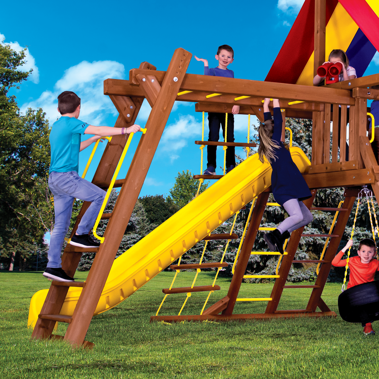 Rainbow Play Systems offers a comprehensive warranty policy for their products. They provide a lifetime warranty on the structural integrity of all lumber components, ensuring they remain strong and reliable. This lifetime warranty also covers various slides, crawl tunnels, swing hangers, and several other structural hardware components. Additionally, a five-year warranty is provided for a range of accessories such as tarps, swings, and steel components. Ropes and flags are covered by a two-year warranty.